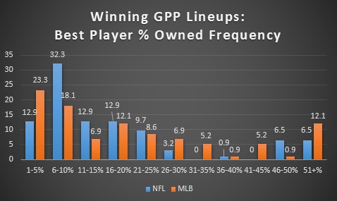 This graph shows the percentage of winning GPP lineups with top-scoring players in specific usage brackets (represented with the percentages at the bottom). For example, the two bars all the way to the left show the percentage of winning GPP lineups in both NFL (12.9 percent) and MLB (23.3 percent) with a high-scoring player who was owned on anywhere between one and five percent of all lineups.