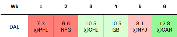 As for redraft leagues, we see the Cowboys pegged for one of the easiest starts in the NFL against some of the weakest pass defenses. Below is a screengrab of 4for4's team level Hot Spots grid. Each cell show opponent and their average adjusted fantasy points allowed. You can see that Dallas is projected for some smooth sailing all the way up until their Week 8 bye.