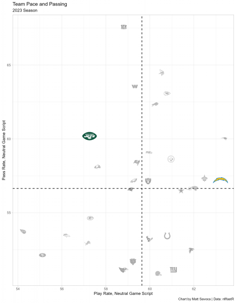 This chart represents the general offensive strategies for each team when the game outcome is still in question (win probability between 20% and 80%). The final two minutes of each half are also excluded. We’ll include last year’s statistics through Week 4 of the regular season. Teams in the upper-right quadrant pass more often and play faster than the average NFL team in neutral game scripts, and conversely, teams in the lower-left quadrant play slower and run more often than the average NFL team.