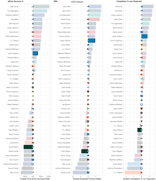 While there may be 22 people on the field for every play, each play and game is heavily dictated by the performance of each team’s quarterback. While efficiency isn’t everything for quarterbacks, it is the best indicator of future performance, so we use a trio of metrics to suss out top performers at the position compared to lackluster ones. xDrive Success %, or True Drive Success Rate, is a measurement of a QB’s ability to turn drives into scores weighted by sample size. EPA or Expected Points Added, is a measurement of the QB’s contribution, both running and throwing, to the team’s scoring and production vs. the average NFL team. Completion % over Expected (CPOE)represents the accuracy and efficiency of a QB’s passes compared to league expectations.