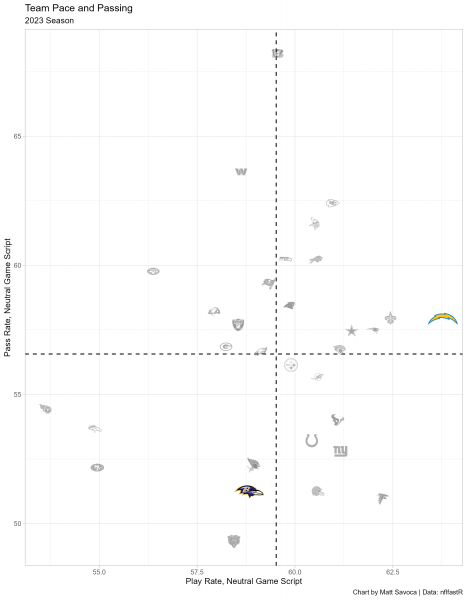 This chart represents the general offensive strategies for each team when the game outcome is still in question (win probability between 20% and 80%). The final two minutes of each half are also excluded. We’ll include last year’s statistics through Week 4 of the regular season. Teams in the upper-right quadrant pass more often and play faster than the average NFL team in neutral game scripts, and conversely, teams in the lower-left quadrant play slower and run more often than the average NFL team.