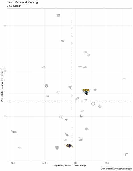 This chart represents the general offensive strategies for each team when the game outcome is still in question (win probability between 20% and 80%). The final two minutes of each half are also excluded. We’ll include last year’s statistics through Week 4 of the regular season. Teams in the upper-right quadrant pass more often and play faster than the average NFL team in neutral game scripts, and conversely, teams in the lower-left quadrant play slower and run more often than the average NFL team.