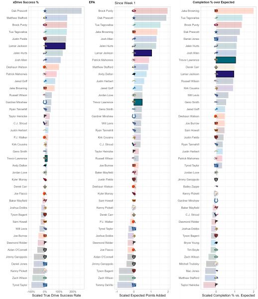 While there may be 22 people on the field for every play, each play and game is heavily dictated by the performance of each team’s quarterback. While efficiency isn’t everything for quarterbacks, it is the best indicator of future performance, so we use a trio of metrics to suss out top performers at the position compared to lackluster ones. xDrive Success %, or True Drive Success Rate, is a measurement of a QB’s ability to turn drives into scores weighted by sample size. EPA or Expected Points Added, is a measurement of the QB’s contribution, both running and throwing, to the team’s scoring and production vs. the average NFL team. Completion % over Expected (CPOE)represents the accuracy and efficiency of a QB’s passes compared to league expectations.