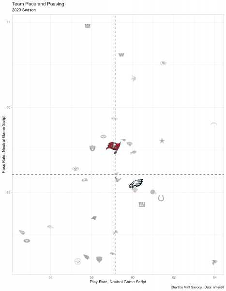 This chart represents the general offensive strategies for each team when the game outcome is still in question (win probability between 20% and 80%). The final two minutes of each half are also excluded. We’ll include last year’s statistics through Week 4 of the regular season. Teams in the upper-right quadrant pass more often and play faster than the average NFL team in neutral game scripts, and conversely, teams in the lower-left quadrant play slower and run more often than the average NFL team.
