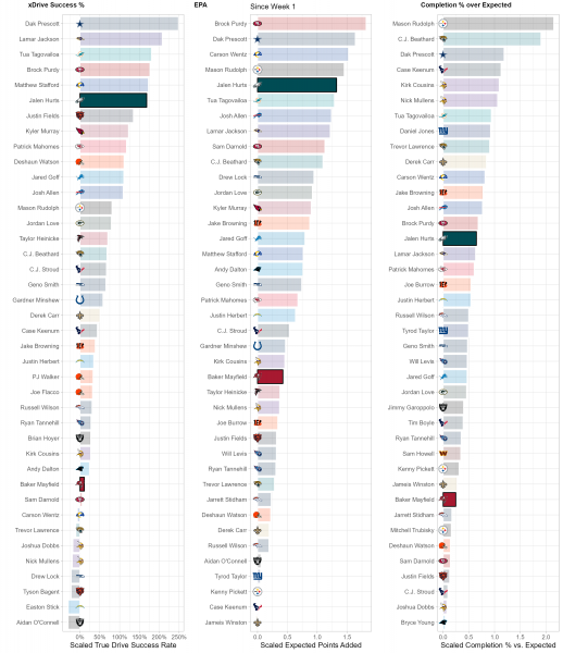 While there may be 22 people on the field for every play, each play and game is heavily dictated by the performance of each team’s quarterback. While efficiency isn’t everything for quarterbacks, it is the best indicator of future performance, so we use a trio of metrics to suss out top performers at the position compared to lackluster ones. xDrive Success %, or True Drive Success Rate, is a measurement of a QB’s ability to turn drives into scores weighted by sample size. EPA or Expected Points Added, is a measurement of the QB’s contribution, both running and throwing, to the team’s scoring and production vs. the average NFL team. Completion % over Expected (CPOE)represents the accuracy and efficiency of a QB’s passes compared to league expectations.