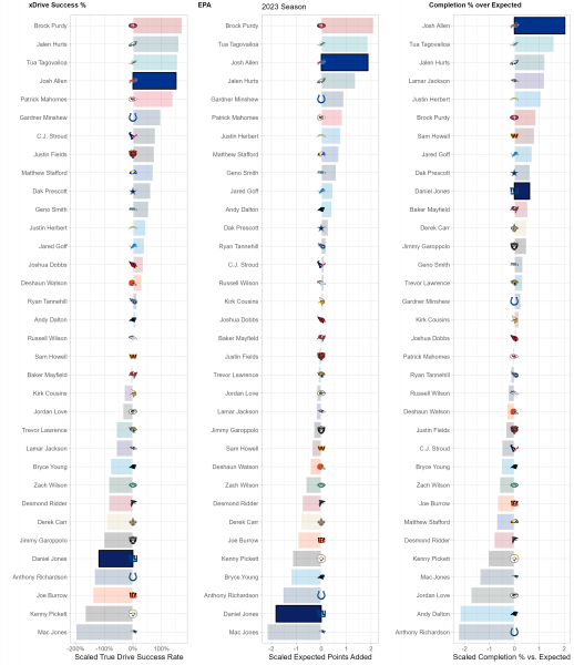 While there may be 22 people on the field for every play, each play and game is heavily dictated by the performance of each team’s quarterback. While efficiency isn’t everything for quarterbacks, it is the best indicator of future performance, so we use a trio of metrics to suss out top performers at the position compared to lackluster ones. xDrive Success %, or True Drive Success Rate, is a measurement of a QB’s ability to turn drives into scores weighted by sample size. EPA or Expected Points Added, is a measurement of the QB’s contribution, both running and throwing, to the team’s scoring and production vs. the average NFL team. Completion % over Expected (CPOE)represents the accuracy and efficiency of a QB’s passes compared to league expectations.