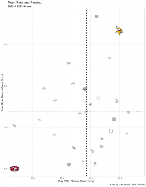 This chart represents the general offensive strategies for each team when the game outcome is still in question (win probability between 20% and 80%). The final two minutes of each half are also excluded. We’ll include last year’s statistics through Week 4 of the regular season. Teams in the upper-right quadrant pass more often and play faster than the average NFL team in neutral game scripts, and conversely, teams in the lower-left quadrant play slower and run more often than the average NFL team.