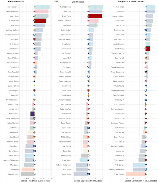While there may be 22 people on the field for every play, each play and game is heavily dictated by the performance of each team’s quarterback. While efficiency isn’t everything for quarterbacks, it is the best indicator of future performance, so we use a trio of metrics to suss out top performers at the position compared to lackluster ones. xDrive Success %, or True Drive Success Rate, is a measurement of a QB’s ability to turn drives into scores weighted by sample size. EPA or Expected Points Added, is a measurement of the QB’s contribution, both running and throwing, to the team’s scoring and production vs. the average NFL team. Completion % over Expected (CPOE)represents the accuracy and efficiency of a QB’s passes compared to league expectations.