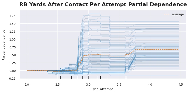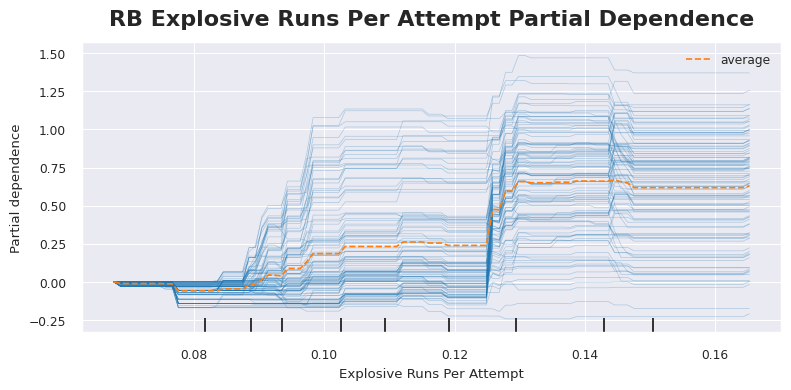 The graph below is a partial dependence plot (PDP) of receiving yards per game. PDPs are a great way to shine some light on the inner workings of machine learning models. They show how each variable affects the model’s predictions while averaging out the effects of the other variables. It’s easiest to focus on the orange line in the graph. As that orange line increases above zero on the y-axis, it means RBs in that range typically score more fantasy points next season. The main takeaway here is that RBs with more than 20 receiving yards per game are more likely to have massive fantasy seasons the next year. Alternatively, fewer than 15 receiving yards per game is a red flag.