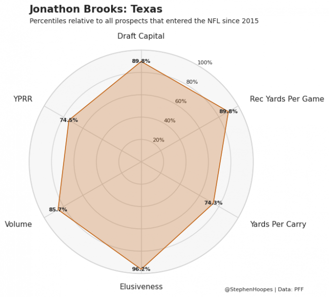 I wanted to bring up Jonathon Brooks here despite not having any NFL statistics on him yet. Rookie RBs with the draft capital Brooks got tend to be very successful fantasy picks in the middle rounds of drafts. The graph below shows a few key stats from Brooks’ college career. There really aren’t any holes in his profile, something that can’t be said for the other rookie RBs in this class.