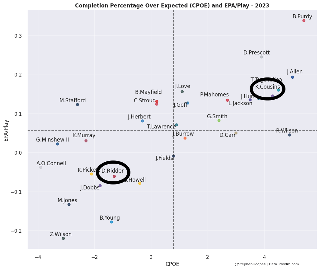 And we’re not just increasing pass volume. We also should see drastically improved passing efficiency. The graph below shows each quarterback’s completion percentage over expected (CPOE) on the x-axis and EPA per play on the y-axis. And I’ve circled both the Falcons’ old QB Desmond Ridder and their newly-signed option Kirk Cousins. They’re on complete opposite corners of the graph.