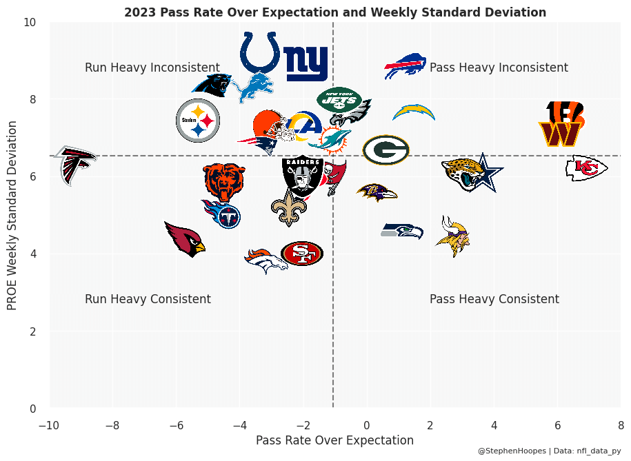 Because of that, we want to prioritize teams with a high pass rate over expected (PROE). The 2023 Atlanta Falcons were…well, not that. The graph below shows each team’s PROE on the x-axis and how much that fluctuated weekly on the y-axis. You’ll find the Falcons in their own stratosphere on the left side of the graph.