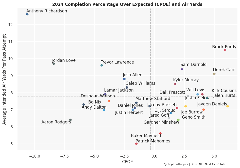 The success of the Commanders’ rushing attack has been a bit of a surprise this season. Jayden Daniels was always expected to be a weapon with his legs. But Brian Robinson, Austin Ekeler, and Jeremy McNichols combined for 129 yards and three touchdowns on 20 carries in Week 5, which was good for about 9.0 EPA. Brian Robinson in particular has been efficient, as he’s 13th out of 59 qualifying RBs in RYOE per attempt. The Commanders lead the league in rushing efficiency through five weeks but do get a tough test against the Ravens defense this week.
