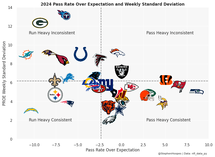 In addition to his deployment, the environment for the Falcons receivers is also improving. The graph below shows pass rate over expected (PROE) on the x-axis and how much that pass rate fluctuates weekly on the y-axis. For the season as a whole, the Falcons are exactly average in PROE. But that does hide their trend throughout the season. The Falcons were about 9% below expectation in each of the first three weeks. And then that changed sharply, hitting the fifth-highest PROE over the last two weeks. My best guess is Kirk Cousins’ improving health is allowing the Falcons to operate in the way they’ve wanted all along. And this week they get to play the Panthers defense, who have the second-least efficient passing defense on the Week 6 slate. Wheels up for Drake London.