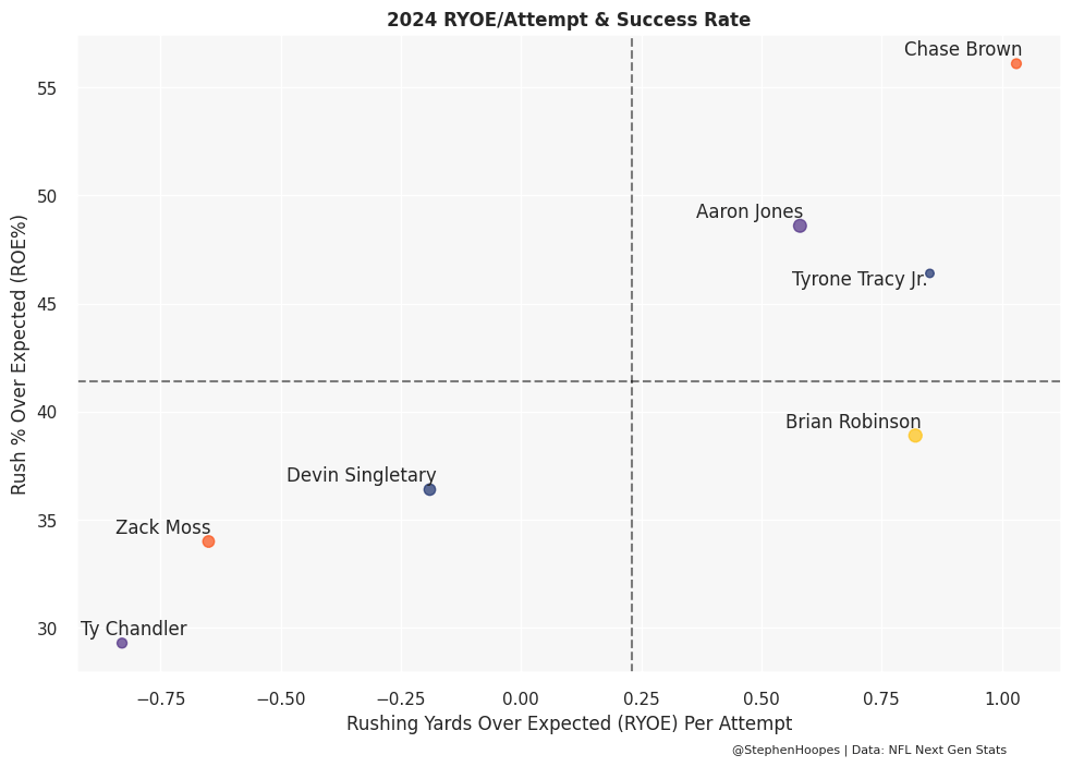 Following an Eric Gray fumble at the goal line, the Giants turned to Tyrone Tracy in Week 5. And Tracy didn’t look back. He had 18 carries for 129 rushing yards to go along with two targets. The main question is whether he played well enough to eat into Devin Singletary’s role when he returns from injury. I personally hope he does. The graph below shows RYOE per attempt on the x-axis and Next Gen Stats’ version of success rate on the y-axis. I’ve included the qualifying Giants RBs and some other interesting splits like the Bengals and Vikings.