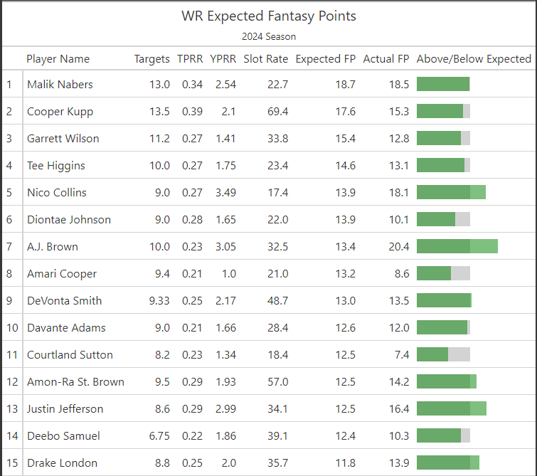 Before Week 3, RBs were crushing WRs in expected fantasy points. Rhamondre Stevenson, Saquon Barkley, and De'Von Achane each had over 19.5 expected fantasy points per game. The closest WR was Malik Nabers at 17.9 points. And while RBs are still beating WRs through five weeks, that top-end has fallen off sharply for RBs. Nabers is now the expected fantasy point leader for both positions. And some highly-drafted WRs like Drake London have turned their season around. Let’s dig into London further.