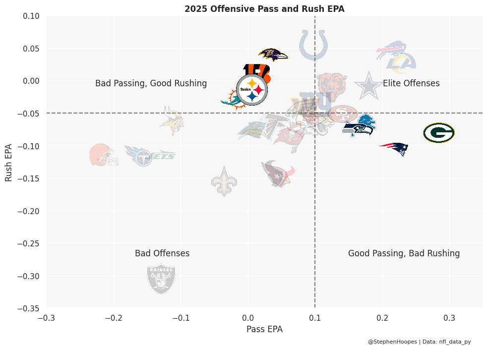 There weren’t many teams with great passing but below-average rushing last year. And three of the four teams in the bottom-right quadrant of the graph below have clear, established starters. The most interesting team to me is the Seahawks. Kenneth Walker is now on the Chiefs, and Zach Charbonnet might not be ready to start the season. It’s a great spot if they opt to draft an RB in the middle rounds of the NFL draft. But it's possible the signing of Emanuel Wilson takes them out of that market.