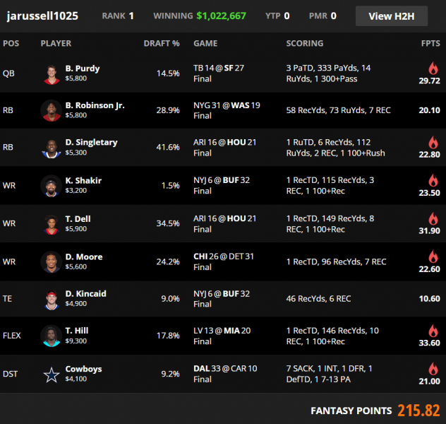 FanDuel Week 11 Sunday Million Winning Lineup