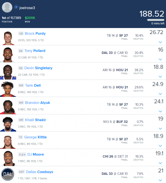 Playing George Kittle added a unique element to a relatively popular stack of Brock Purdy and Brandon Aiyuk. Paying all the way up at tight end led to a unique roster construction in a week where none of the four tight ends priced at $6,000 or above projected for double-digit ownership.