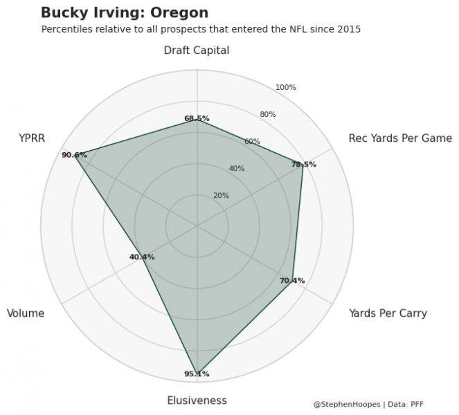 • However, there isn’t an obvious candidate to eat into his rushing workload, with Irving profiling as a similarly elite receiving back with a relatively small number of rushing attempts per game during his collegiate career.