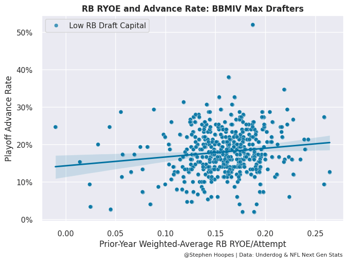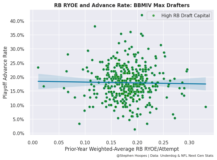 However, that’s not the case for RYOE. Each data point in the two graphs below is a drafter that entered BBMIV 150 times. The x-axis is the RYOE per attempt of their average drafted RB, while the y-axis is the percentage of teams that drafter advanced to the playoffs. As the RYOE of a drafter’s average RB increases, so does their advance rate. But this connection really only holds for teams that tended to take RBs later in drafts. For teams that tended to draft RBs in the early rounds, the connection went away. So, that’s good news for White given that he goes in the early-sixth round in Underdog drafts. However, there is one other concerning trend with White’s RYOE.