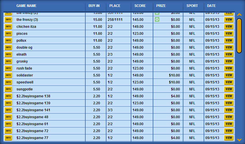 There’s not a significant amount of risk in doing that, as you can see from this week’s results, but I really like the potential profitability of tournaments this year. We all know there are more fish than ever on these daily sites, but they don’t seem to be playing heads-up contests. I continually find myself matched up with sharks, so that’s not good for anyone. To get more action against the fish, I probably need to enter leagues with more entrants.