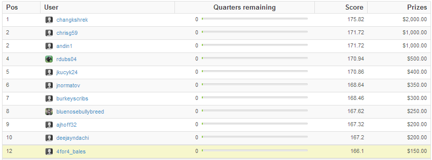 It happens. You need to be able to sustain those losses. While I’m never “glad” to lose money, I’m glad that I had a pretty poor week and still managed to remain profitable for the season.