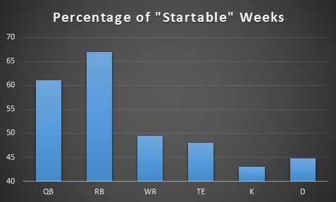 I charted the number of “startable” weeks for the players at each position. A “startable” week was defined as finishing in the top 33 percent at the position (among the top 30 quarterbacks, tight ends, defenses, and kickers and the top 75 running backs and wide receivers).
