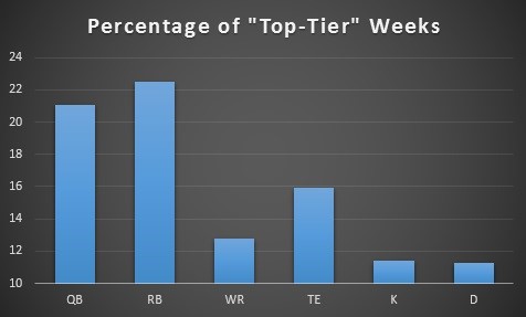Taking it a step further, I analyzed the percentage of “top-tier” weeks turned in by each position. I defined “top-tier” as a top two finish for quarterbacks, tight ends, kickers, and defenses or a top five finish for running backs and wide receivers (the top 6.7 percent for each position).
