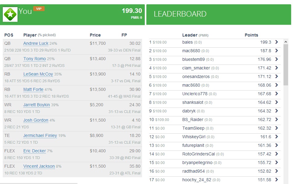 I had a large percentage of my head-to-head action at FanDuel this week, and it resulted in $1.20 in losses. Cool. I won a couple small tournaments at DraftKings, but still ended up down there (same for DraftDay).