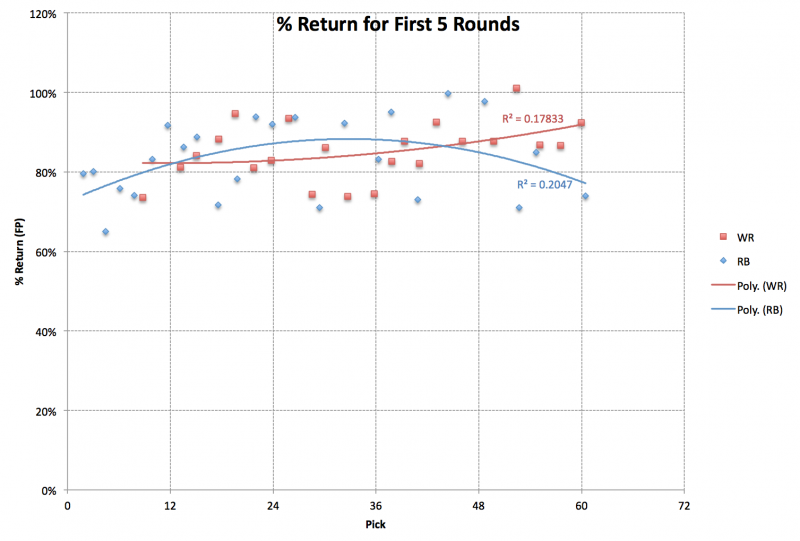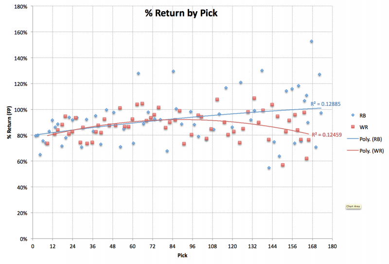 This is essentially the same graph, but it includes all of the data I collected. I included it here to point out that running backs that go in the later rounds (Round 8/9 and later) tend to provide a higher return than their WR counterparts. Using pick #84 as the cutoff, late-round RBs have averaged a 97.8% return, while WRs have averaged 87.1%. This would seem to support the idea that owners can find functional running backs in the later rounds.