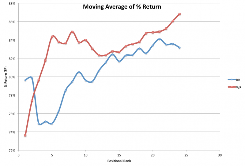 The above graph further illustrates how the %R changes as we move down the positional ranks. Again, the top two (drafted) running backs tend to fare well, but once we get into the meat of the 1st round, the WR position tends to become more dependable. The moving averages start to converge once we’re through the top 10 at each position.