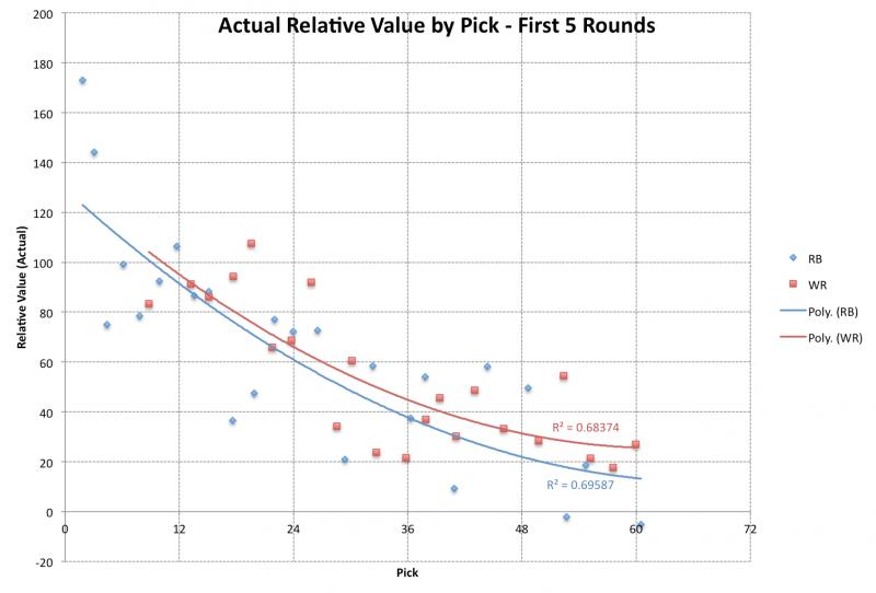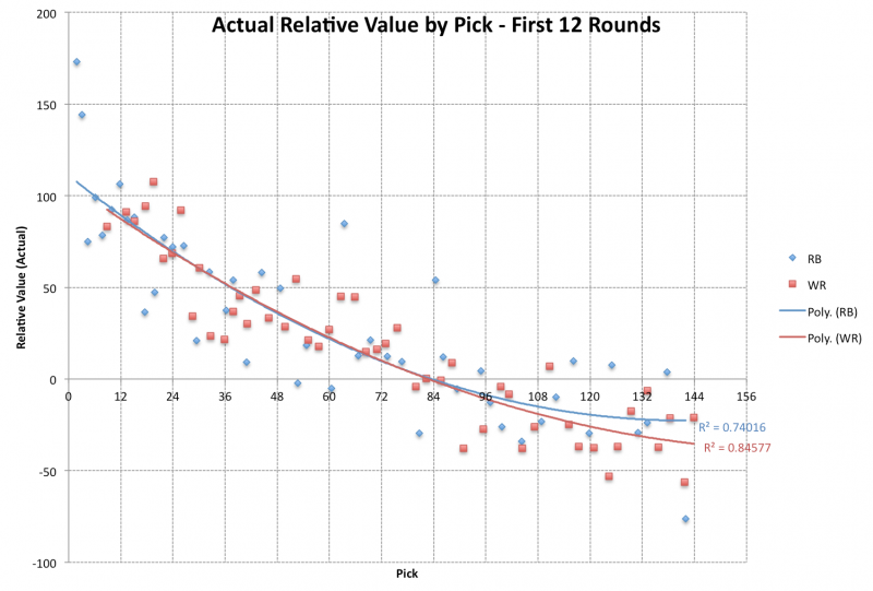The above graph shows actual, year-end RV for the first 12 rounds. Notice how close the trendlines are for the first seven rounds before starting to diverge in Round 8. This indicates that, as a whole, the running back position offers more RV than the receiver position in the later rounds (8th-12th) of the draft.