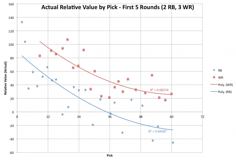For example, if your league starts two running backs and three receivers, you could use a last starter baseline of #24 for RBs and #36 for WRs, which would further enhance the appeal of drafting receivers in the 1st or 2nd round. Here’s the “First Five” graph for such a scenario: