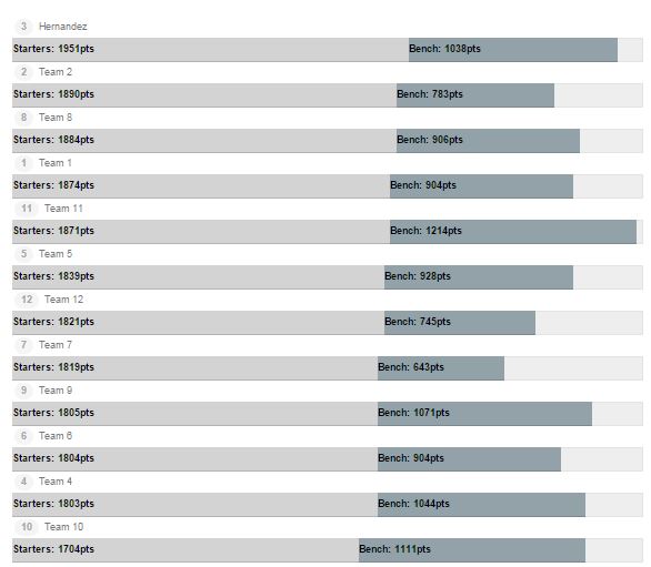 Given my early round strategy, I'm very pleased with my depth and upside at the skill positions. If any of my mid round running backs break out, this can be a dominant roster. There is enough depth in the player pool that I can stream quarterback, tight end and defense when needed, and I didn't spend enough on any of those positions to make me hesitant to do so. Because I didn't draft a backup quarterback, my total projected points rank second, but I have the best projected starting lineup by a comfortable margin.