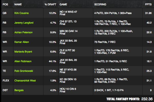 Once again, we see opposing passing game correlation with Allen Robinson and Kamar Aiken. Langford and West were the keys, however, as both were under five percent owned. Both backs served as a reminder that with volume comes upside, even in a tough matchup.