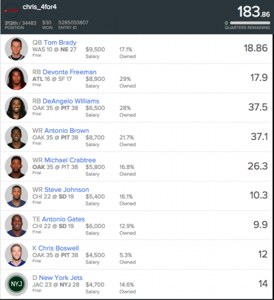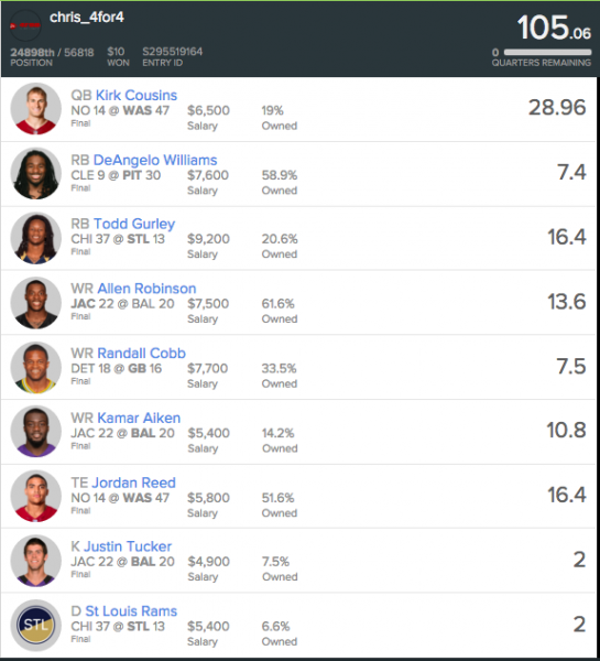 Week 9 was a good week for the cash game lineup, as it hit 183 and propelled me to a 58-0 head-to-head record. I had some solid turnament success as well, and ended up winning $507.60 on $282 of money in play, good for a profit of $225.60. I used the exact players I wrote up in the FanDuel Week 9 Cash Game Breakdown, so check that out for the rationale behind each choice.