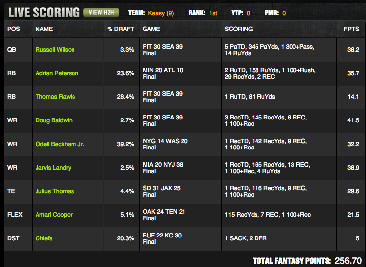 Well the five plays owned 5.1% or less surely stands out, perhaps more important was keasy wasn't scared to pair QB Wilson and WR Baldwin with negatively-correlated chalk RB Thomas Rawls. Rawls's mediocre 14.1 points didn't help keasy out much, but because Rawls was a 28.4% owned chalk play, it kept Wilson's and Baldwin's ownership levels depressed, and keasy took advantage of the differentiation that could be obtained by rostering them. Of late, I've continuously talked up the theory that entrants hopeful of winning the grand prize in large GPPs need to put aside their hesitation to pair players with largely irrelevant negative correlations, and keasy's winning lineup further validates that viewpoint.