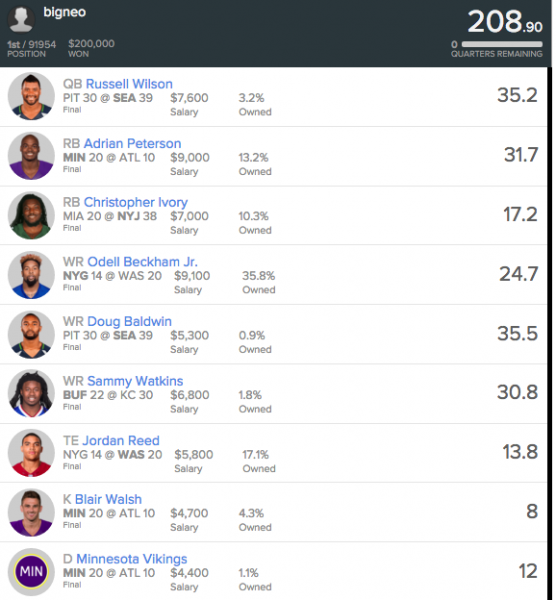 FanDuel user bigneo took down the grand prize with a stack of Russell Wilson and Doug Baldwin, along with a stack of Adrian Peterson and the Vikings defense.
