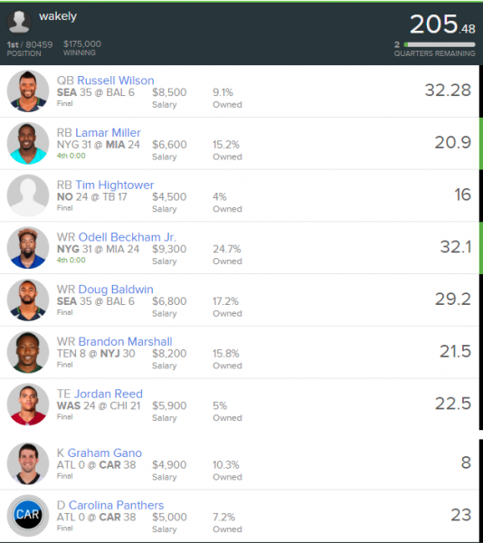 The Wilson and Baldwin pairing -- which 4for4's Joe Holka wrote up in his weekly Stacking the Deck column (available to DFS subscribers) -- combined for 61.48 points. Wakely also used a correlated pairing by stacking Graham Gano with the Panthers defense. Wakely took advantage of a contrarian viewpoint on the Saints-Buccaneers game, going with the gameflow-dependent RB on the underdog instead of any members of the passing game on either team. He also rostered two of the featured offensive players in the Giants-Dolphins game. Let's get into his low-owned plays.