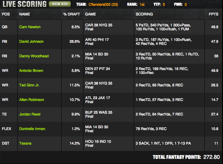 Cflanders002's lineup was pretty standard. His QB was relatively low owned (Cam Newton at 8.5%). He combined a chalk RB (David Johnson) with a low owned RB (Danny Woodhead) to create his backfield. He had two expensive WRs (Antonio Brown and Allen Robinson) as well as one cheap contrarian play (Dontrelle Inman).