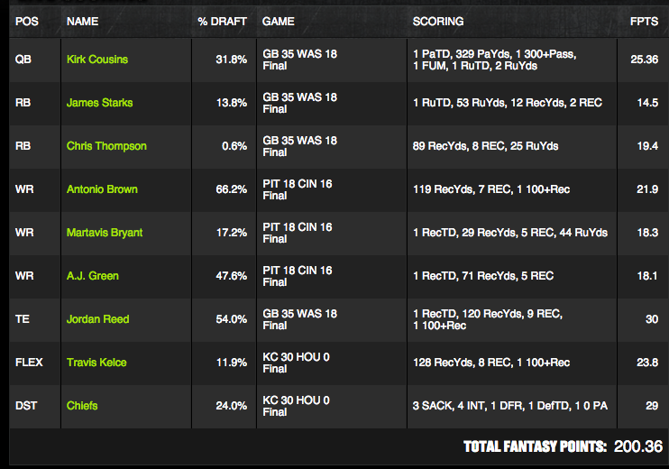 The key to the lineup was getting 19.4 points out of Chris Thompson at 0.6% ownership. There won't always be a player to score that highly at such a low level of ownership, but it does underscore the importance of nailing a contrarian play. Also, using a TE in the flex becomes a lot more viable on a short slate; this was the first time all season that a winning Millionaire Maker lineup contained two TEs.