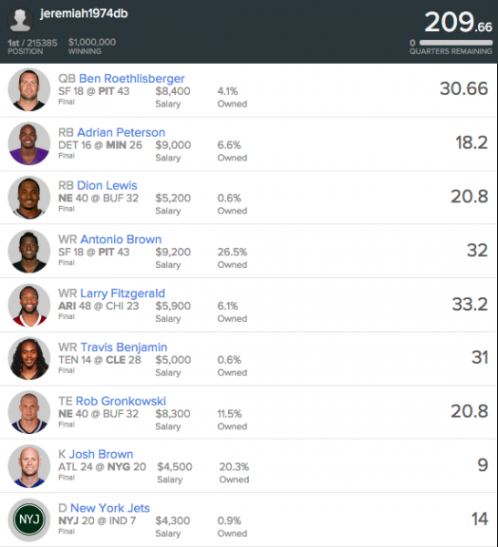 Ill indeed, Greg; ill indeed. While 21 percent of the field paid $4,900 for the Rams (4 points), 17 percent of the field paid $5,100 for the Dolphins (0 points), and 12 percent paid $5,000 for the Ravens (-1 points), jeremiah1974db was making ill contrarian plays. He paid only $4,300 for the Jets -- a team 99.1 percent of the field didn't touch -- which gave him 14 points and allowed him to field a highly differentiated lineup en route to winning the one million dollar grand prize.