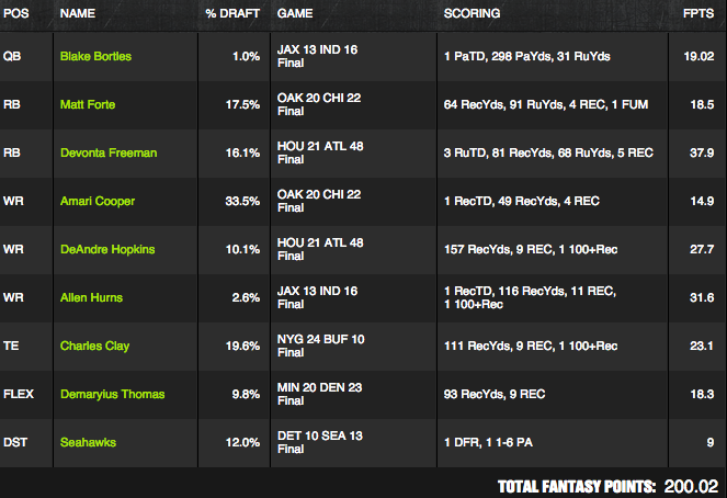 With Blake Bortles at one percent owned and Allen Hurns at 2.6 percent, almost no one had the stack, which was also very cheap and allowed ChipotleAddict to fill out his roster with dependable, high-volume players.