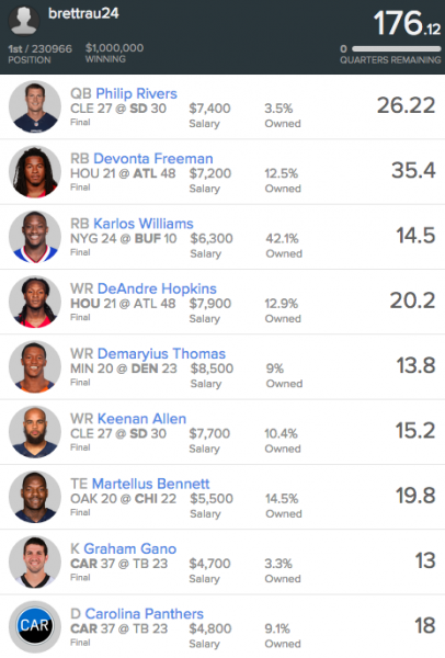 At $7,400, Philip Rivers was one of the cheaper QBs owned in the contest, yet led all QBs in FanDuel points. Rostering the inexpensive Rivers afforded brettrau24 the cap space necessary to pivot off the most popular WR options by paying up (his average WR cost over $8,000) for wideouts who ended up outscoring them. He also employed a correlated kicker-defense stack with the Panthers that netted him 31 points. Let's break down his best plays.