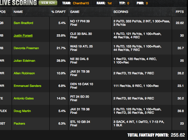 Seven of his eight position players as well as his defense scored a TD, with three players scoring multiple TDs. Highlighting the importance of volume, his three RBs combined to average 29 touches.