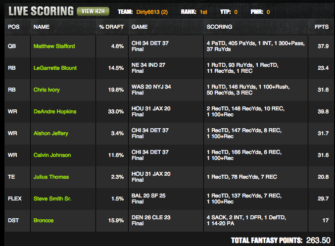 Every spot in the lineup -- including defense -- scored at least one TD. His lineup shows the importance of nailing the WR position, as all of his WRs eclipsed 130 yards and scored a TD. He was greedy when others were fearful with regards to rostering Matthew Stafford, Alshon Jeffery, and Steve L Smith.