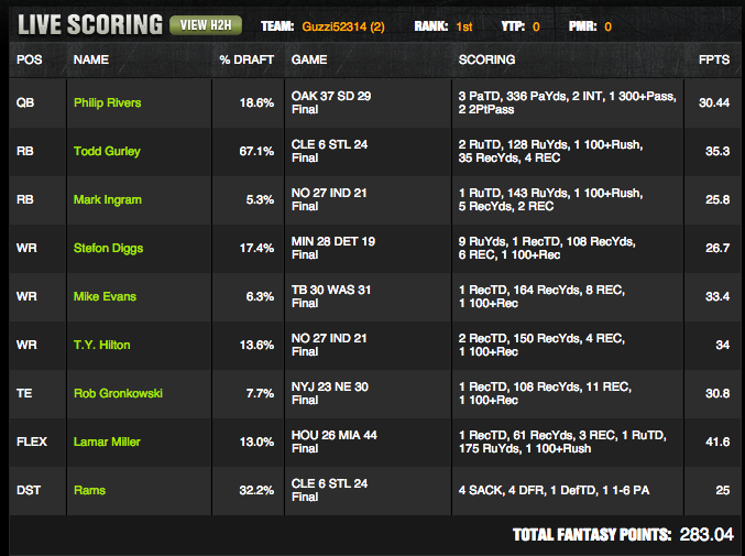 Every spot in the lineup -- including defense -- scored at least one TD. His lineup scored 13 TDs in all. It's also worth noting that every player in the lineup hit a yardage bonus.
