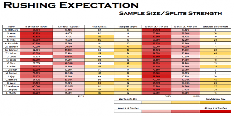 These charts should not be taken purely as gospel, but it does show where some players stood out in certain categories. As most of you are in the midst of season-long drafts, I thought it would be important after this enlightening Rushing Expectation process to highlight some of the running backs that I am bullish on and some that I am bearish on: