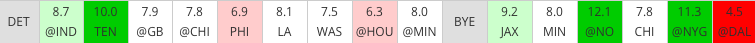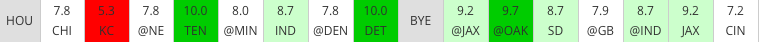 Eight games out of their schedule are against teams in either the great or good category in 4for4’s SOS metric. The Texans’ opponents are slotted to give up 13.4 points per game to the tight end position which bodes well for this tandem. All three of the Texans’ AFC South opponents rank in the the bottom 10 in aFPA to tight ends this season with Tennessee expected to allow 15.3 schedule-adjusted PPR points, Jacksonville at 14.3 points and Indianapolis coming in as the eighth worst with 14.1 points.